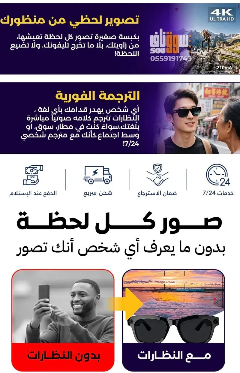 🕶 نظارات الذكاء الاصطناعي: 🌍 ترجمة فورية، 📸 تصوير ذكي ، 📞 مكالمات بدون يدين! سعة تخزين داخلية 32 جيغابايت لتسجيل لحظاتك ومعلوماتك أينما كنت.