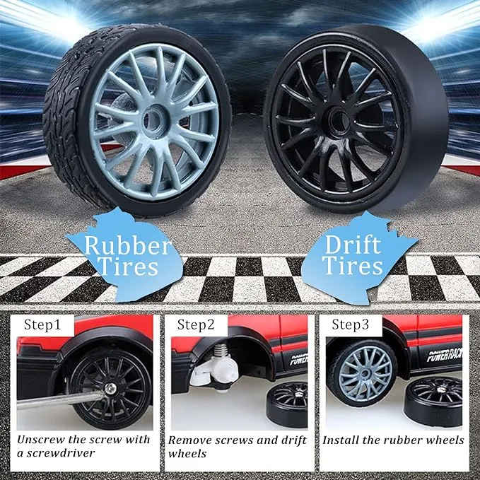 - 💡[Racing Drift Equipped]: Remote control drift car is equipped with 4 racing tires and 4 Drift tires, 3.7V 500mAh Rechargeable Battery and USB Charging Cable, 6 Traffic Cones. You only need such a car to experience the fun of racing and drift. The two kinds of tires can be dismounted and replaced, which is convenient to use in various venues.